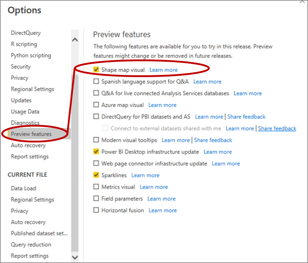 - In Power BI, the “Shape Map” is included as a Preview Feature. You can activate it by clicking on “File” then selecting “Options and Settings” and then Clicking on “Options”. This will open up the following dialogue box where you can select the “Preview Features” tab and click on “Shape Map visual”.