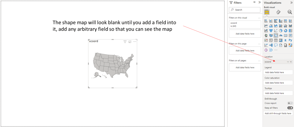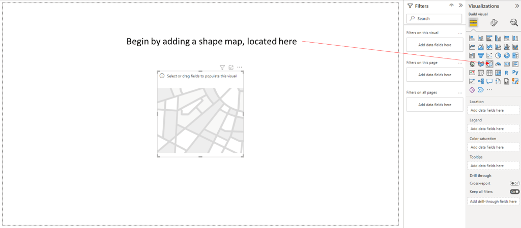 6. Now that your map is loaded, you you can load additional files into Power BI and use their fields to color code your map with the “Colour saturation” setting
