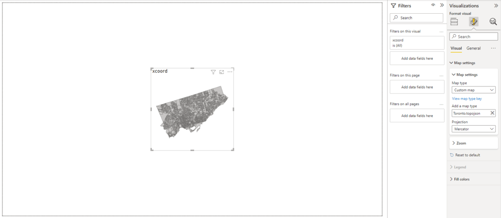 It is important to note that although the Power BI is able to display all of the Dissemination Areas (DAs) in Toronto, there is an upper limit on the number of shapes that it can color code. Depending on the geography you are working with, you may need to think of your area in sections to be able to display your color coded data appropriately.
